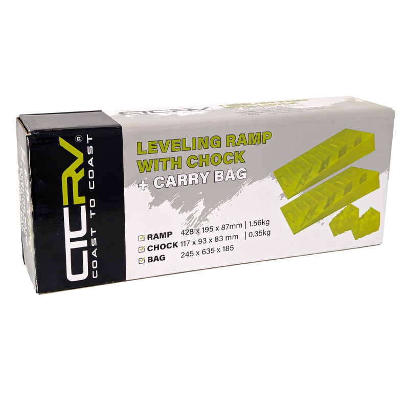 The ramp offers a max lift height of 90mm, making it ideal for slight inclines or uneven surfaces. The included chock ensures that once your vehicle is levelled, it stays that way, while the compact size makes it easy to pack and store between trips. With this levelling kit, you can quickly set up camp without worrying about awkward angles, so you can enjoy a more comfortable and safer interior. Whether you’re parked on gravel, dirt, or grass, this kit ensures that your caravan remains steady and secure throughout your stay.