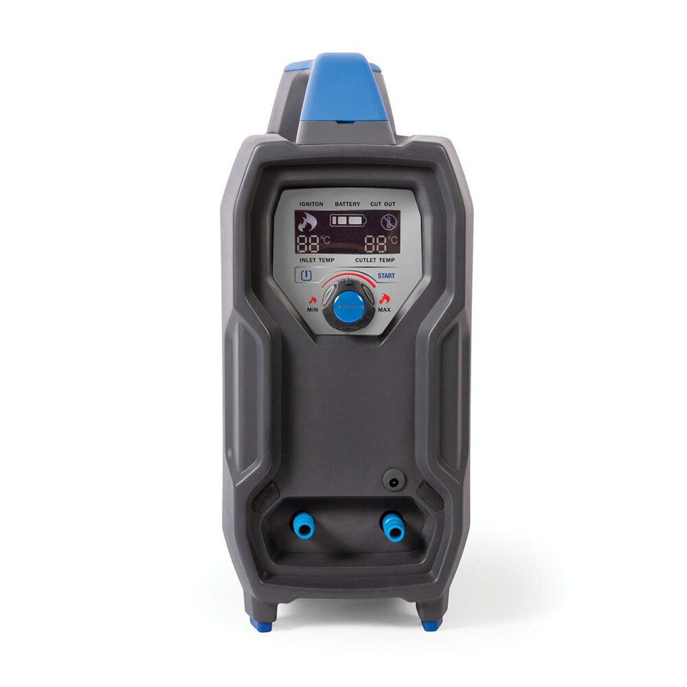 The Aquaheat Water Heater offers control at your fingertips. The digital display control panel provides essential information at a glance, including inlet temperature, outlet temperature, battery charge level, and an on/off dial.