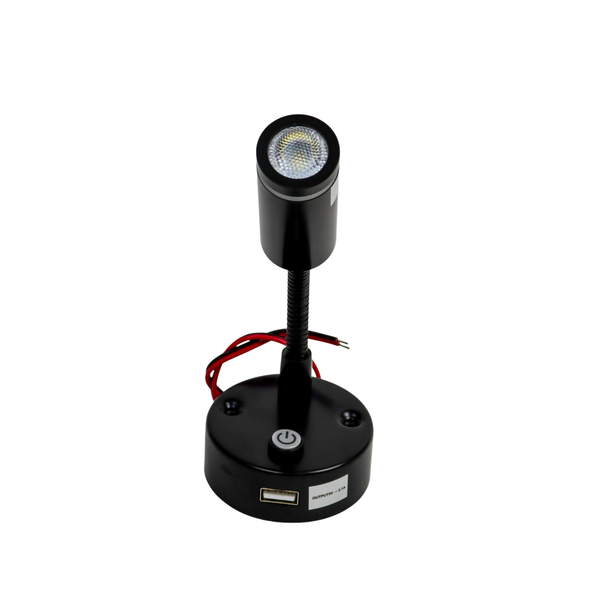 Matte black finish Flexible reading light with dual colour (cool white/blue) 10-15 volts 150mA AMP draw Has a USB charger for devices Comes with installation screws and guide 60mm dia. base x 165mm (h)
