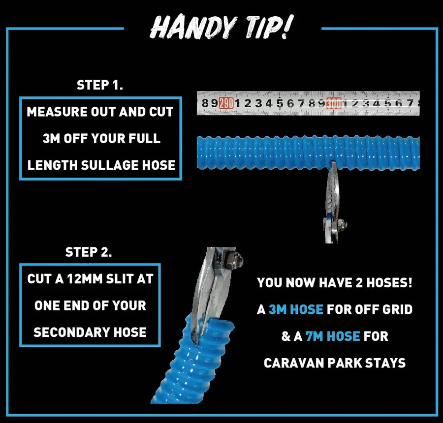 Two hoses in one - Measure out and cut 3 metres off your full length sullage hose. This will leave you with a 3m length for off grid camping and a 7m length for your stays at caravan parks. You can then cut a 12mm slit at one end of your secondary hose to make it easy to fit and remove the sullage hose from your van's barbed end.
