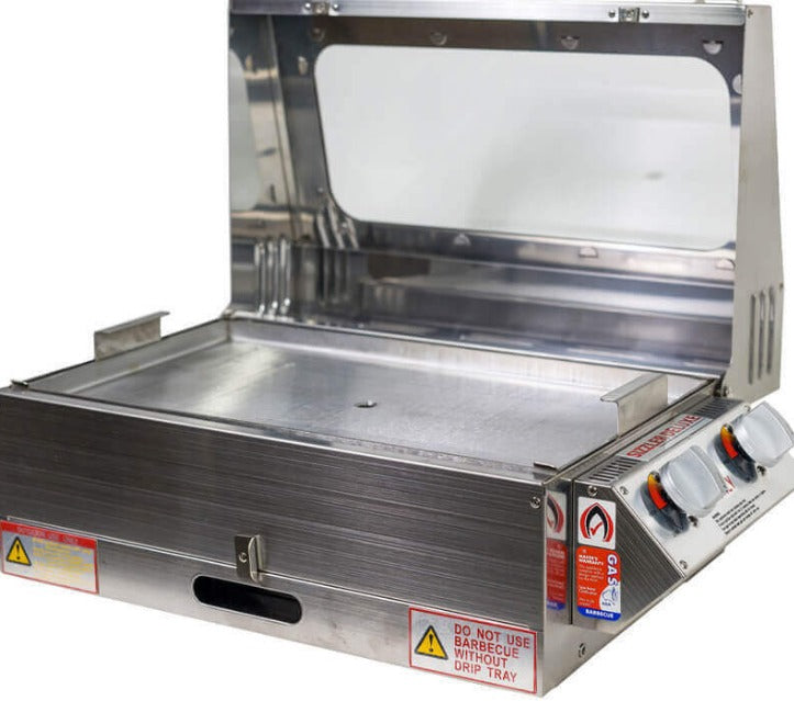 A barbecue (BBQ) with cover, that suits the optional 'Quick Release Slide System' and mount in your Caravan, motorhome, truck, ute or camper trailer.