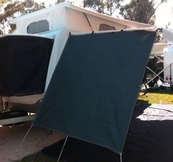 - Black end wall privacy screen specifically manufactured to suit pop top caravans
